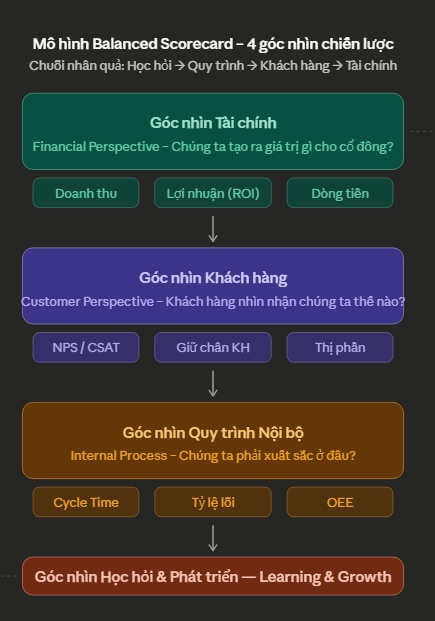 Điểm cốt lõi của BSC nằm ở cấu trúc 4 góc nhìn (perspective). Đây không phải 4 chỉ số ngẫu nhiên, chúng tạo thành một chuỗi nhân quả liên kết chặt chẽ với nhau.