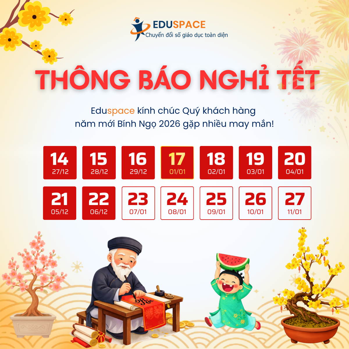 Eduspace thông báo lịch nghỉ Tết Bính Ngọ 2026 tới Quý khách hàng & Đối tác. Trong thời gian nghỉ lễ, hệ thống phần mềm Eduspace vẫn hoạt động bình thường. Nếu có vấn đề kỹ thuật, Quý khách vui lòng liên hệ hoặc để lại tin nhắn qua kênh hỗ trợ, chúng tôi sẽ cố gắng phản hồi sớm nhất có thể.
