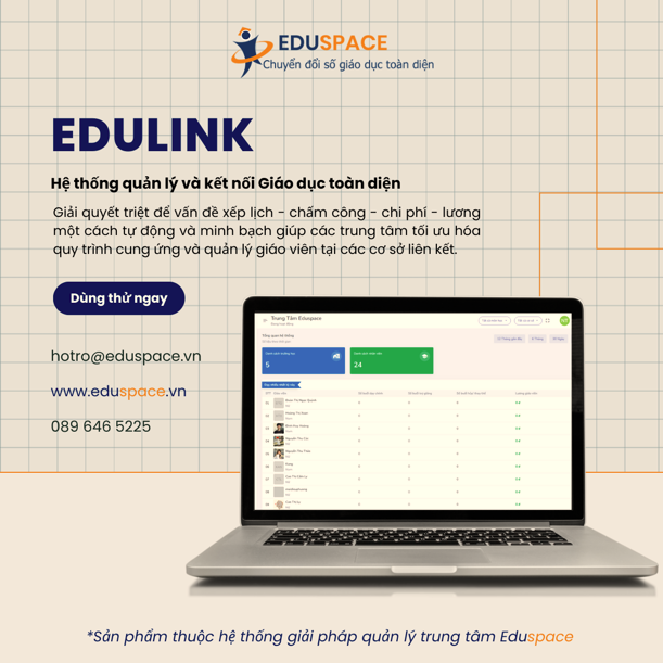 Edulink là hệ thống quản lý giáo viên, huấn luyện viên đột phá giúp tự động hóa xếp lịch, chấm công và tính lương. Giải pháp minh bạch tối ưu nguồn lực giáo viên cho các cơ sở, trung tâm giáo dục.